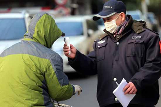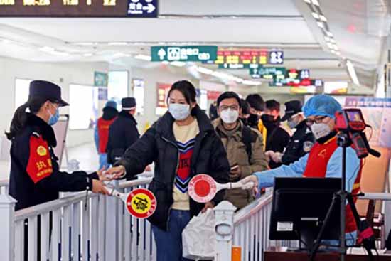 Le 2 février 2020, le flux des passagers de la gare de la ville de Changzhou dans le Jiangsu augmente. Une équipe de prévention coordonnée composée de policiers, d'agents de soins et de bénévoles communautaires prennent la température de chaque passager à la sortie de la gare, vérifient leur identité afin de contr?ler l'épidémie. (Chen Wei/Photo du people.com.cn)
