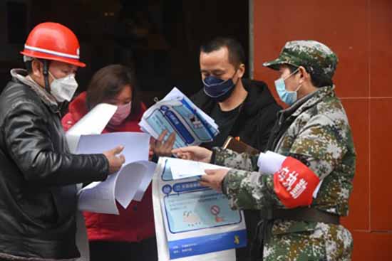Le 2 février 2020, devant l'entrée de chaque résidence de l'arrondissement Jianye de la ville de Nanjing, les employés de la rue et de quartier, ainsi que les agents de sécurité sont de service. Ils prennent la température des personnes entrant dans la résidence. Des notices sur l'épidémie sont affichées sur la porte d'entrée de la résidence. (Yu Tian/Photo du people.com.cn)