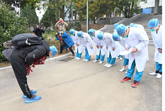 Le 6 mars, les 3 derniers patients atteints du Covid-19 de la ville de Huainan de la province d'Anhui sont guéris et sont sortis de l'h?pital. Un patient s'est incliné en signe de remerciement devant le corps médical du 1er H?pital du peuple de la ville de Huainan (h?pital qui traite des maladies infectieuses). Chen Bin/Photo du Quotidien du Peuple