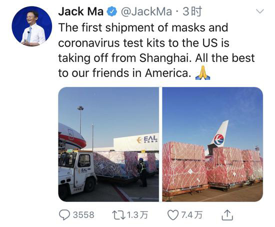 Il a également retweeté un article de la Fondation Jack Ma sur le don de kits de test et de masques aux états-Unis, disant : ? Nous sommes aux c?tés des Américains en ces temps difficiles ?.