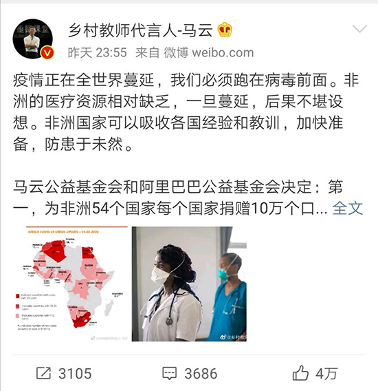 Afin de soutenir les pays africains dans la lutte contre l'épidémie de coronavirus, La fondation Jack Ma et la fondation Alibaba ont décidé de faire don de 100 000 masques, 1 000 vêtements de protection et 1 000 masques de protection à chacun des 54 pays d'Afrique, et aussi de faire don de 20 000 kits de test à chaque pays africain. Les deux fondations coopéreront également immédiatement avec les institutions médicales des pays africains pour fournir du matériel de formation en ligne pour le traitement clinique du nouveau coronavirus.