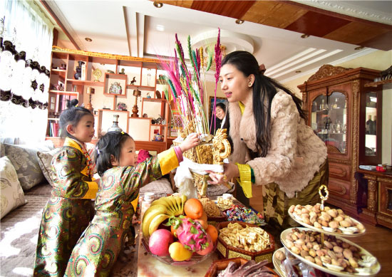 Une famille de la région autonome du Tibet (sud-ouest de la Chine) célèbre le nouvel an tibétain à la maison, le 24 février 2020. (Tentsen Shinden / pour chinadaily.com.cn)