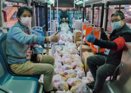 Pour gagner la bataille contre l'épidémie, les services communautaires assurent toujours la gestion des quartiers placés sous confinement à Wuhan. Dans la nuit du 24 février 2020, quand la nuit est tombée, dans le quartier de Tangcai de la rue Tangjiatun de la ville de Jianghan à Wuhan, les gardiens du quartier et les bénévoles ont chargé le bus avec 11 sortes de packs de produits frais emballés dans des sacs individuels. Li Changlin/Photo du Quotidien du Peuple