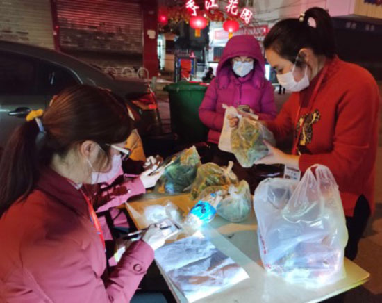 Dans la nuit du 24 février 2020, quand la nuit est tombée, dans le quartier de Tangcai de la rue Tangjiatun de la ville de Jianghan à Wuhan, les gardiens du quartier et les bénévoles ont contacté les habitants par téléphone pour qu'ils descendent chercher les packs de produits frais. Li Changlin/Photo du Quotidien du Peuple
