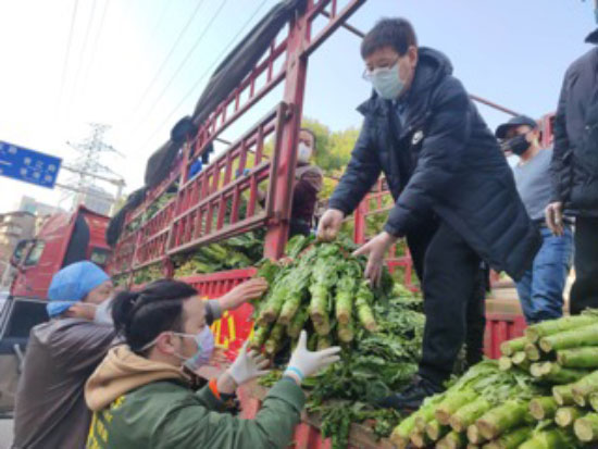 Le 27 février 2020, au batiment No.3, 3 rue Jihuier du quartier de Huizhong de la rue Laodong de l'arrondissement de Jiang'an de Wuhan au Hubei, par les achats groupés des services communautaires, les habitants ont re?u les "packs de légumes à 10 yuan" qui bénéficiaient des subventions gouvernementales. On y trouvait plus de 3 variétés de légumes, dont des laitues asperges, des carottes et des pommes de terre. Zhou Guoqiang/Photo du Quotidien du Peuple