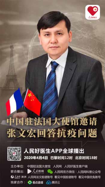 Le 4 avril à 18h, heure de Beijing (le 4 avril à 12h, heure de Paris), l'Ambassade de Chine en France va inviter le professeur Zhang Wenhong à communiquer en ligne avec les étudiants chinois et les Chinois en France pour répondre à leurs questions concernant le développement de l'épidémie et la prévention personnelle, etc.