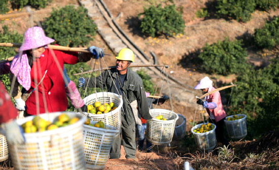 Des agriculteurs portent des paniers d'oranges navel dans un verger de Huichang, dans la province du Jiangxi (l'est de la Chine) en 2019. (Chen Zebing / China Daily)
