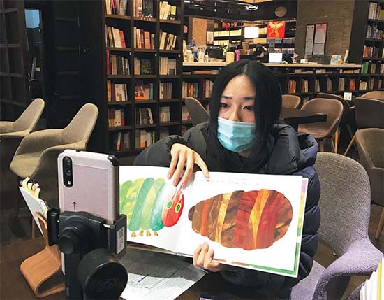 Un employé de la librairie Zhongshuge lit un livre sur la diffusion en direct à Shanghai. (Niu Jing / pour le China Daily)