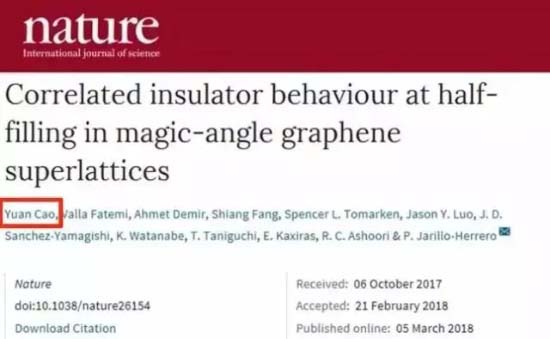 Le 6 mai, heure locale, Cao Yuan a publié deux articles consécutifs sur le graphène dans le dernier numéro de ? Nature ?. Ce qui est encore plus impressionnant, c'est que le 5 mars 2018, ? Nature ? avait déjà publié deux articles d'affilée sur son site Internet, avec Cao Yuan comme premier auteur de ces articles de qualité sur le graphène et un commentaire du professeur Eugene J. Mele de l'Université de Pennsylvanie sur cette percée majeure, faisant de Cao Yuan le plus jeune universitaire chinois à être publié comme premier auteur dans ? Nature ? !