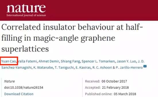 Et déjà le 5 mars 2018, ? Nature ? publiait consécutivement sur son site Internet deux superbes articles sur le graphène, avec Cao Yuan comme premier auteur. Il est également devenu le plus jeune universitaire chinois à publier ses travaux en tant que premier auteur dans ? Nature ?.