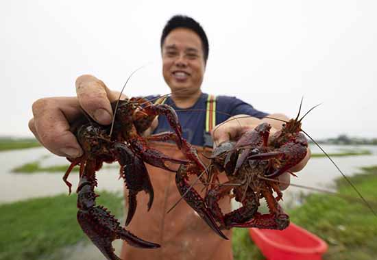 Dans une base d'élevage de crevettes de rizières de 700 mus dans le village de Zhentian, dans la zone de haute technologie du canton de Shuixi de la ville de Xinyu, dans la province du Jiangxi (est de la Chine), Hu Yunping, un pionnier qui s'est enrichi, montre les écrevisses qu'il a capturées. Photo prise le 9 mai. (Zhao Chunliang / Pic.people)