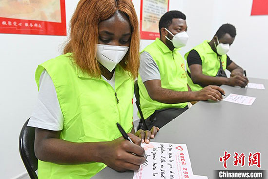 Le 20 avril, dans l'arrondissement de Baiyun de Guangzhou, les membres de l'équipe des jeunes bénévoles étrangers de la rue Tonghe remplissent la carte de mots de soutien. Photo par Chen Jimin, journaliste de China News Service