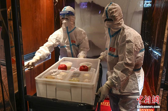 Le 14 avril, dans l'h?tel international, le siège de la cité des sciences de Guangzhou dans l'arrondissement de Huangpu à Guangzhou dans la province du Guangdong, le bénévole Rufino Eugenio Guilherme (à droite) livre le petit-déjeuner aux personnes en quarantaine. Rufino Eugenio Guilherme, 26 ans, d'origine angolaise, fait ses études en 4e année de Licence à l'Université de technologie du Sud de la Chine. Photo par Chen Jimin, journaliste de China News Service