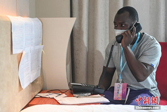 Le 18 avril, dans l'h?tel international, le siège de la cité des sciences de Guangzhou dans l'arrondissement de Huangpu à Guangzhou dans la province du Guangdong, le bénévole Rufino Eugenio Guilherme appelle les étrangers mis en quarantaine dans cet h?tel pour savoir s'ils vont bien. Rufino Eugenio Guilherme, 26 ans, d'origine angolaise, fait ses études en 4e année de Licence à l'Université de technologie du Sud de la Chine. Photo par Chen Jimin, journaliste de China News Service