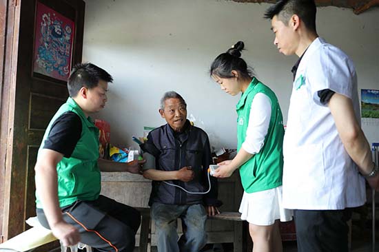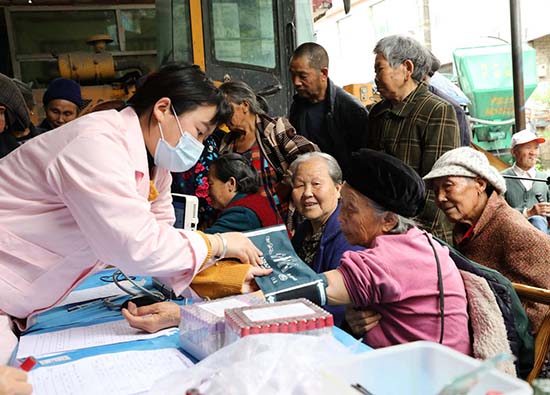 Le 14 mai, les personnels médicaux ont effectué l'examen physique aux personnes agées dont les enfants travaillent dans les villes dans le village de Huanglian du bourg de Qingshuiping du comté de Baojing de la province du Hunan. Yu Caihua/Photo du Quotidien du Peuple