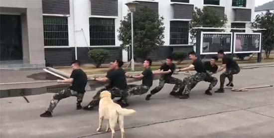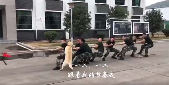 Dans la province de l'Anhui (est de la Chine), les soldats de la police armée sont dans un jeu serré de tir à la corde, et le chien militaire ne supporte plus de ne les regarder que comme spectateur.