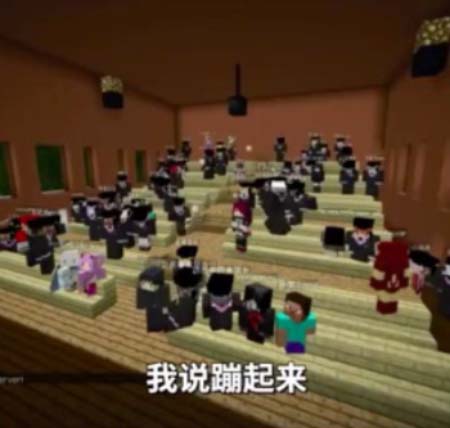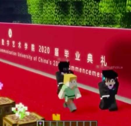 Lors de la cérémonie de remise des dipl?mes, les professeurs qui sont présentés ? sautent ? et ? rebondissent ? et les étudiants ? volent ? sur le tapis rouge. Les étudiants peuvent également recevoir leurs robes universitaires et pointer en ligne sur le campus virtuel, qui est de style pixel et reproduit des scènes de la réalité...
