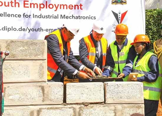 Le président kényan Uhuru Kenyatta (à gauche) et le président allemand Frank-Walter Steinmeier (2e à gauche) posent la première pierre d'un centre d'excellence dans la formation en mécatronique industrielle à l'Institut de la science et de la technologie de Kiambu (KIST) dans le comté de Kiambu, au Kenya, le 25 février 2020. Le Kenya et l'Allemagne ont lancé un programme de formation professionnelle pour l'autonomisation des jeunes qui dotera les jeunes des compétences nécessaires pour leur permettre de contribuer efficacement au développement du pays. (Charles Onyango / Xinhua)