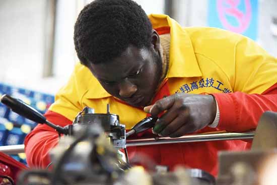 Sergio Thompson étudie les compétences sur la réparation d'automobile dans un cours de pratique au Collège technique Lanxiang du Shandong à Jinan, capitale de la province du Shandong (est de la Chine), le 26 février 2019. (Wang Kai / Xinhua)