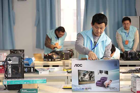 Des jeunes participent à un match d'assemblage informatique lors d'un concours de compétences professionnelles pour les jeunes handicapés à l'Université de technologie de Tianjin à Tianjin (nord de la Chine), le 26 novembre 2016. (Shen Hua / Xinhua)