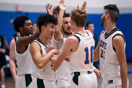 La photo prise en 2018 montrant le Chinois Guanda Huang (2e gauche, à l'avant) participant à un programme de formation post-universitaire en basketball à l'Académie DME des sports (DMESA), à Daytona Beach en Floride, aux états-Unis. (Zou Guangping / Xinhua)