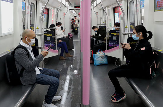 Des passagers portant des écouteurs utilisent leur téléphone portable lors d'un trajet en métro à Wuhan, capitale de la province du Hubei (centre de la Chine), le 29 mars. (Wang Jing / China Daily)