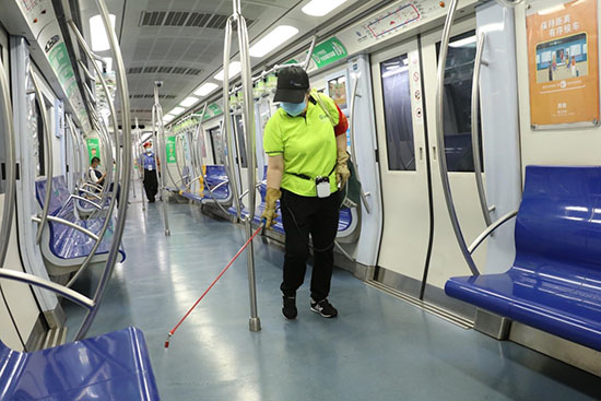 Le 21 juin, des employés désinfectent le métro à Beijing. Des voitures de métro sont désinfectées régulièrement chaque jour pour assurer la sécurité des voyageurs lors du déplacement. (Chen Xiaogen/Pic.people)