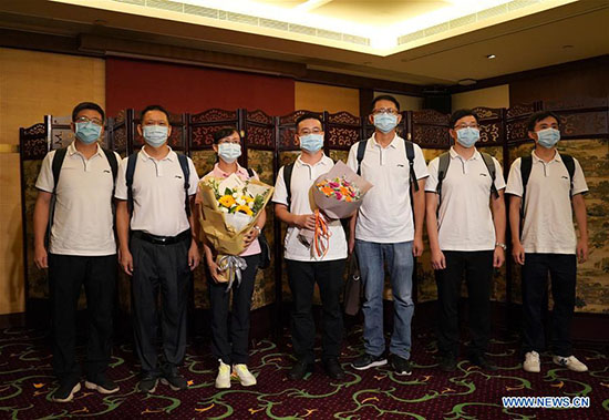 Sept professionnels de dépistage venant de la partie continentale posent pour une photo de groupe après leur arrivée à Hong Kong, le 2 ao?t 2020. (Photo : Li Gang)