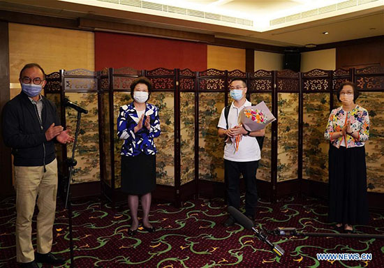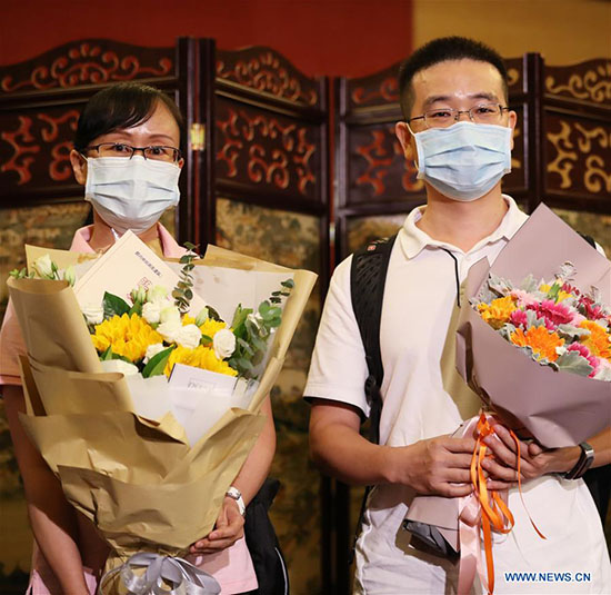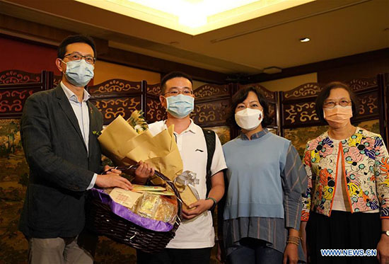 Guo Penghao (deuxième à gauche), chef d'une équipe de sept professionnels de dépistage du virus venus de la partie continentale, re?oit un bouquet de fleurs d'une représentante des habitants locaux à Hong Kong, le 2 ao?t 2020. (Photo : Li Gang)
