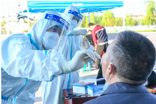 Le 31 juillet, des personnels médicaux du 183e régiment de la 10e division du centre de contr?le et de prévention des maladies du Corps de production et de construction du Xinjiang effectuent prélèvement oro-pharyngé pour des résidents. (Li Zhenghu/Pic.people)