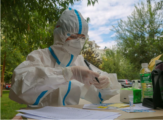 Le 4 ao?t, des personnels médicaux de l'H?pital du people du comté de Jinghe du Xinjiang effectuent le prélèvement. (Sai Yongjie/Pic.people)