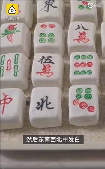 Il faut normalement trois heures à deux personnes pour faire les raviolis et environ une heure pour dessiner un paquet entier de mahjong, qui contient 42 pièces, a expliqué M. Yang, ajoutant qu'ils utilisaient du colorant alimentaire pour dessiner les motifs afin de s'assurer qu'on peut les manger.