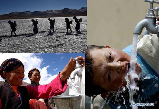 Sur cette photo combinée, la partie supérieure gauche montre des résidents brisant la glace de surface pour y puiser de l'eau dans un lac du comté de Nagarze, dans la préfecture de Shannan de la région autonome du Tibet (sud-ouest de la Chine) ; la partie inférieure gauche montre des agriculteurs du comté de Gonggar de la préfecture de Shannan utilisant de l'eau du robinet propre ; la partie droite montre un jeune gar?on buvant de l'eau potable dans le comté de Sa'gya de la préfecture de Xigaze, dans la région autonome du Tibet.