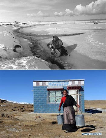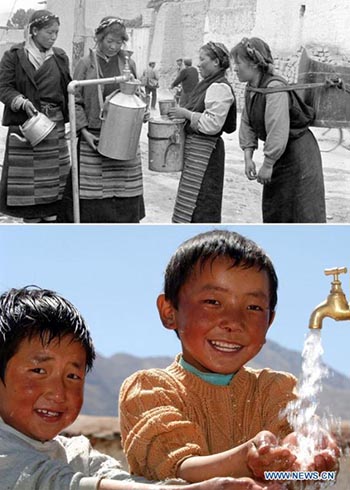 Sur cette photo combinée, la partie supérieure montre des habitants qui vont chercher de l'eau du robinet dans le canton de Gyangze, dans la région autonome du Tibet (sud-ouest de la Chine). Auparavant, la population locale allait chercher de l'eau à des sources éloignées jusqu'à ce qu'une petite usine d'eau du robinet soit créée dans les années 1980 dans le canton pour fournir de l'eau potable. La partie inférieure montre des enfants se lavant avec de l'eau du robinet dans le comté de Dagze (aujourd'hui district de Dagze) de la ville de Lhassa, capitale de la région autonome du Tibet.
