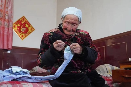 Su Caixia, 95 ans, est heureuse de faire des travaux d'aiguille. La température dans la pièce est chaude et les membres de la famille préparent un repas.