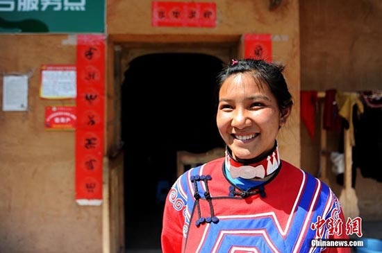 Une villageoise sourit devant sa maison dans le village de Sanhe, dans le comté de Zhaojue de la préfecture autonome Yi de Liangshan, dans la province du Sichuan (sud-ouest de la Chine), en mars 2020. (Photo / Chinanews.com)