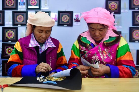 Des habitantes du village de Banyan cousent des Panxiu, un type traditionnel broderie, dans un atelier du comté autonome Tu de Huzhu à Haidong, dans la province du Qinghai (nord-ouest de la Chine), le 26 ao?t 2020. (Photo / Xinhua)