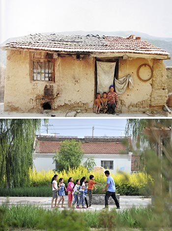 Une série de photos montrant une famille assise devant sa maison il y a plus de 20 ans lorsque le développement de la nouvelle ville venait de commencer à Minning (photo du haut) et des enfants jouant dans le canton de Minning à Yinchuan, dans la région autonome Hui du Ningxia (nord-ouest de la Chine), en ao?t 2018. (Photo / Xinhua)
