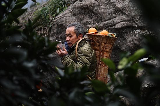 Mao Xianglin communique avec les marchands de fruits en transportant des oranges dans un panier porté sur son dos près du village de Xiazhuang, dans la municipalité de Chongqing (sud-ouest de la Chine), le 7 janvier. (Wang Quanchao / Xinhua)