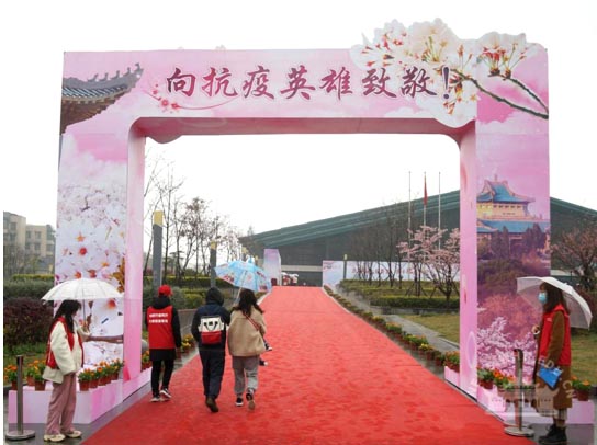 L'Université de Wuhan a mis en place un passage réservé exclusivement aux personnels soignants et à leurs familles qui sont venus admirer les cerisiers en fleur. (Photo fournie par le site official de l'Université de Wuhan)