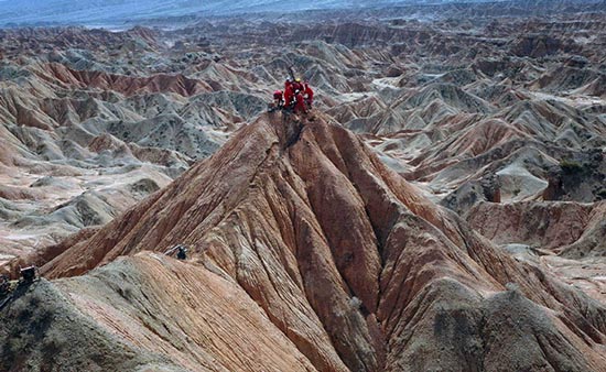 Les arpenteurs du champ pétrolifère Tarim de China National Petroleum Corp travaillent dans une vallée aride de la région autonome ou?ghoure au Xinjiang. YU WENGUO/pour CHINA DAILY