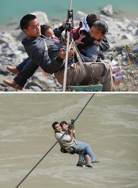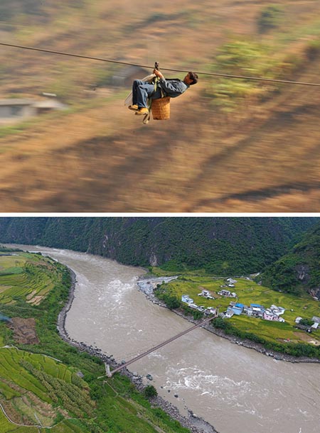 De nombreux villages dans les montagnes ont construit des téléphériques. Le premier téléphérique en acier a été installée sur la rivière Nujiang en 1957. Le téléphérique a représenté un moyen de transport très pratique, mais a aussi laissé des souvenirs amers aux résidents.