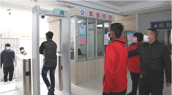 Le 6 mars 2020, un appareil de reconnaissance faciale prend la température des étudiants étrangers à l'école de formation professionnelle scientifique de Nantong dans la province du Jiangsu (dans l'est de la Chine). Les étudiants entrent dans leur dortoir s'il n'y a pas d'anomalies. (Feng Kaimin/ Pic.people.com.cn)