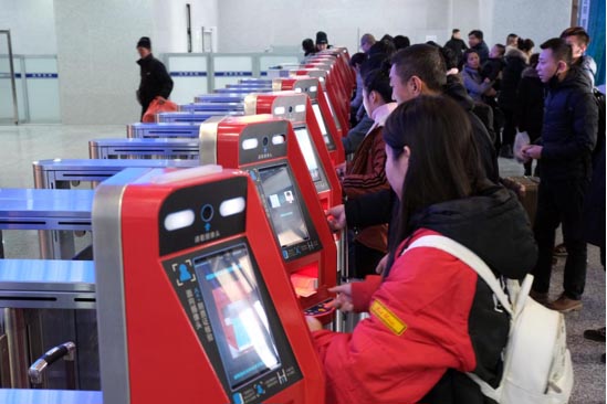 Des voyageurs "scannent leur visage" par le système de reconnaissance faciale pour entrer dans la gare du nord de Shenyang. (Huang Jinkun/Pic.people.com.cn)