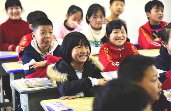 Dans la ville de Shangrao, dans la province du Jiangxi (est de la Chine), des élèves suivent attentivement un cours à l'école primaire centrale de Zhangcun, où 80% des enfants sont des enfants laissés sur place par leurs parents partis travailler ailleurs. Photo prise le 25 mars 2021. (Zhu Zhenqiang / Pic.people.com.cn)