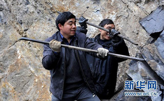 Wang Guangguo et les villageois commencent la construction de la route sur la falaise.