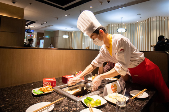 Un employé préparait une table pour les clients dans un restaurant Haidilao à Changsha, capitale de la province du Hunan (centre de la Chine), en mars. (Photo / Xinhua)