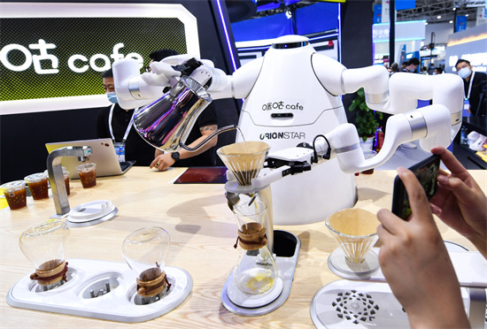 Un robot à intelligence artificielle préparait du café à l'Exposition internationale de l'industrie de mégadonées de Chine à Guiyang, capitale de la province du Guizhou (sud-ouest de la Chine), le 26 mai 2021. (Photo / Xinhua)