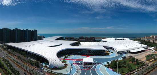 Photo aérienne montrant le Centre international des congrès et expositions de Hainan, le lieu de la première exposition internationale de produits de consommation de Chine à Haikou, capitale de la province du Hainan (sud de la Chine), le 9 mai 2021. (Photo / Xinhua)