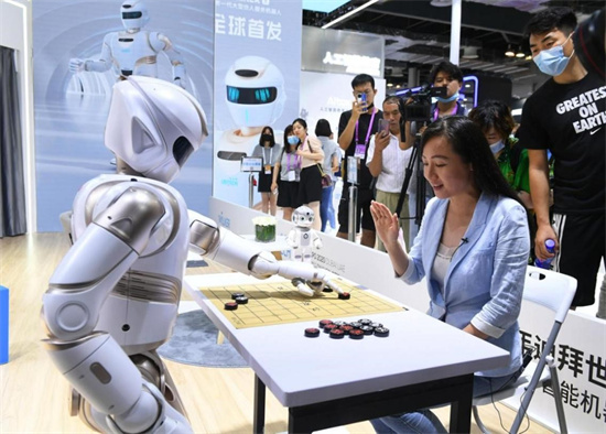 Le 7 juillet, à la session de préparation avant la Conférence internationale sur l'Intelligence artificielle (WAIC), une visiteuse joue aux échecs avec un robot. (Yang Jianzheng / Pic.people.com.cn)